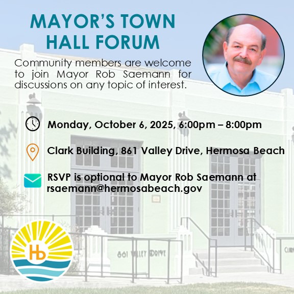 Community members are welcome to join Mayor Rob Saemann for discussions on any topic of interest. 6 – 8 p.m. Clark Building, 961 Valley Drive, Hermosa Beach. RSVP is optional to Mayor Rob Saemann at rsaemann@hermosabeach.gov.