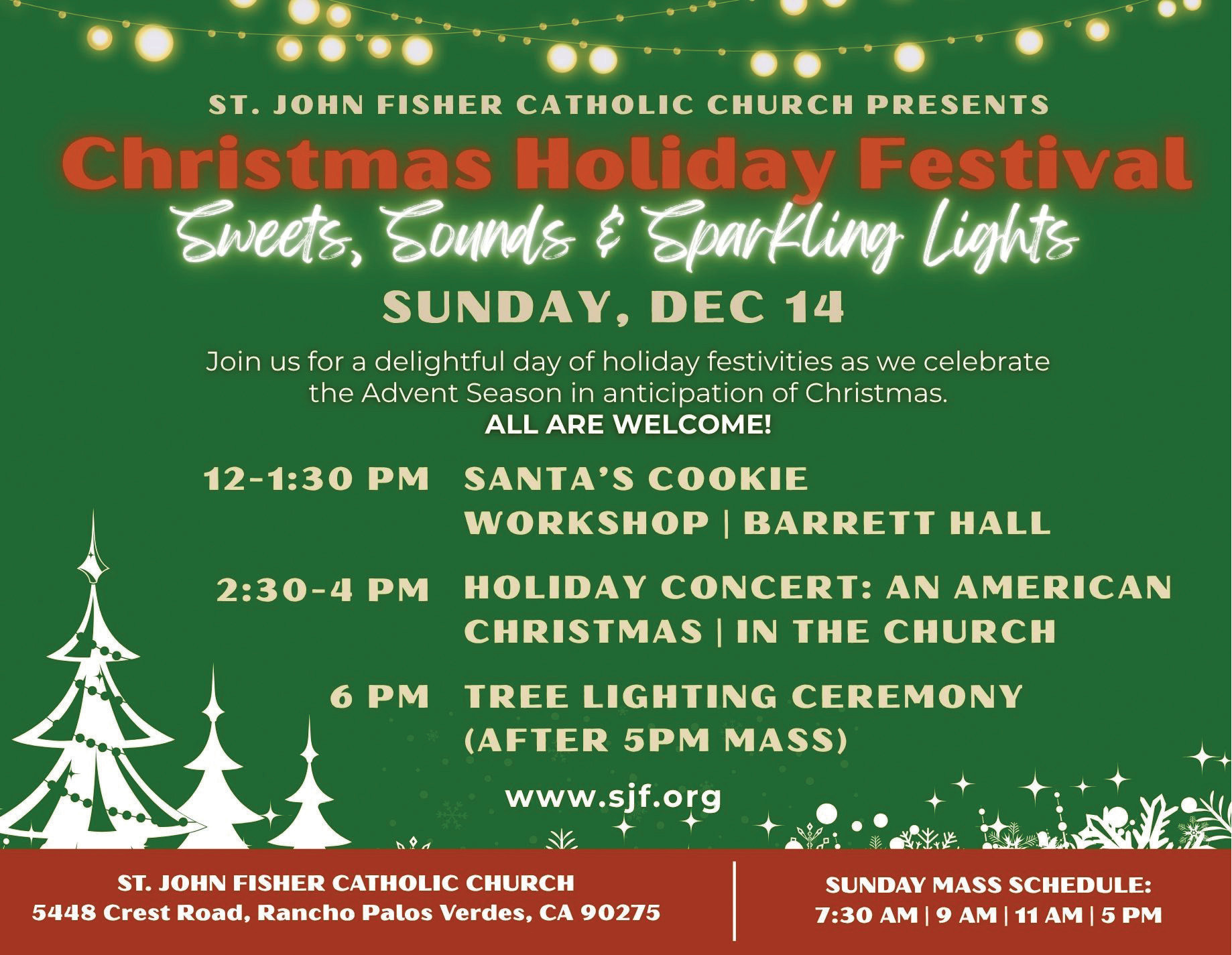 St. John Fisher Catholic Church presents Christmas Holiday Festival. Sweets, Sounds and Sparkling Lights. A delightful day of holiday festivities as we celebrate the Advent Season in anticipation of Christmas. Santa’s Cookie Workshop, Holiday Concert and Tree Lighting Ceremony. 12–6 p.m. 5448 Crest Road, Rancho Palos Verdes. For more information and Sunday Mass schedule, visit sjf.org.