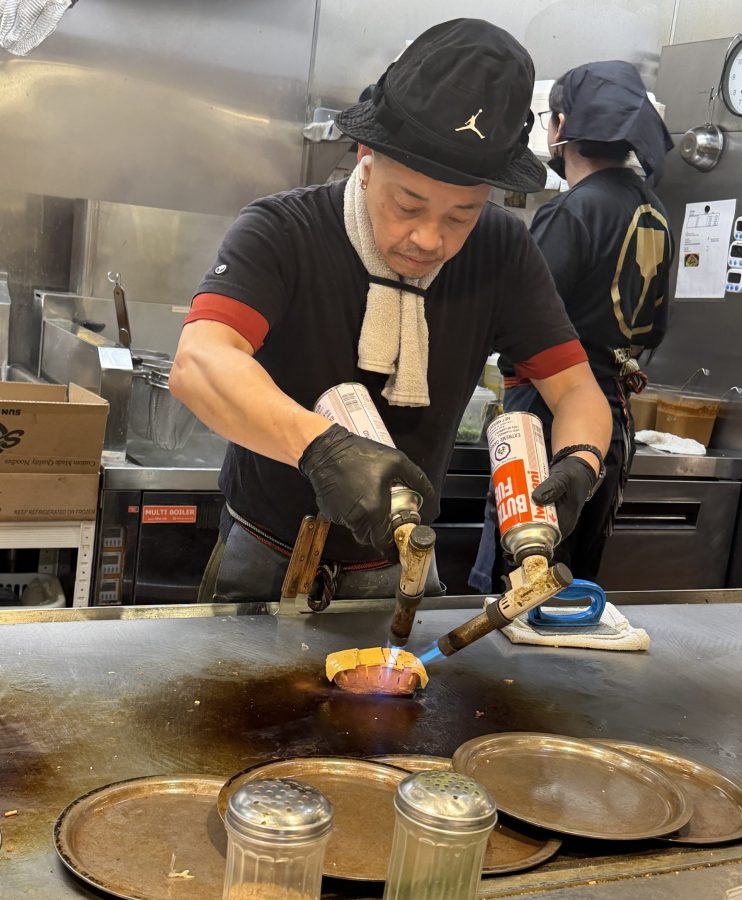 A chef uses a blowtorch on our order of "cheesy accordian spam." Photos by Richard Foss