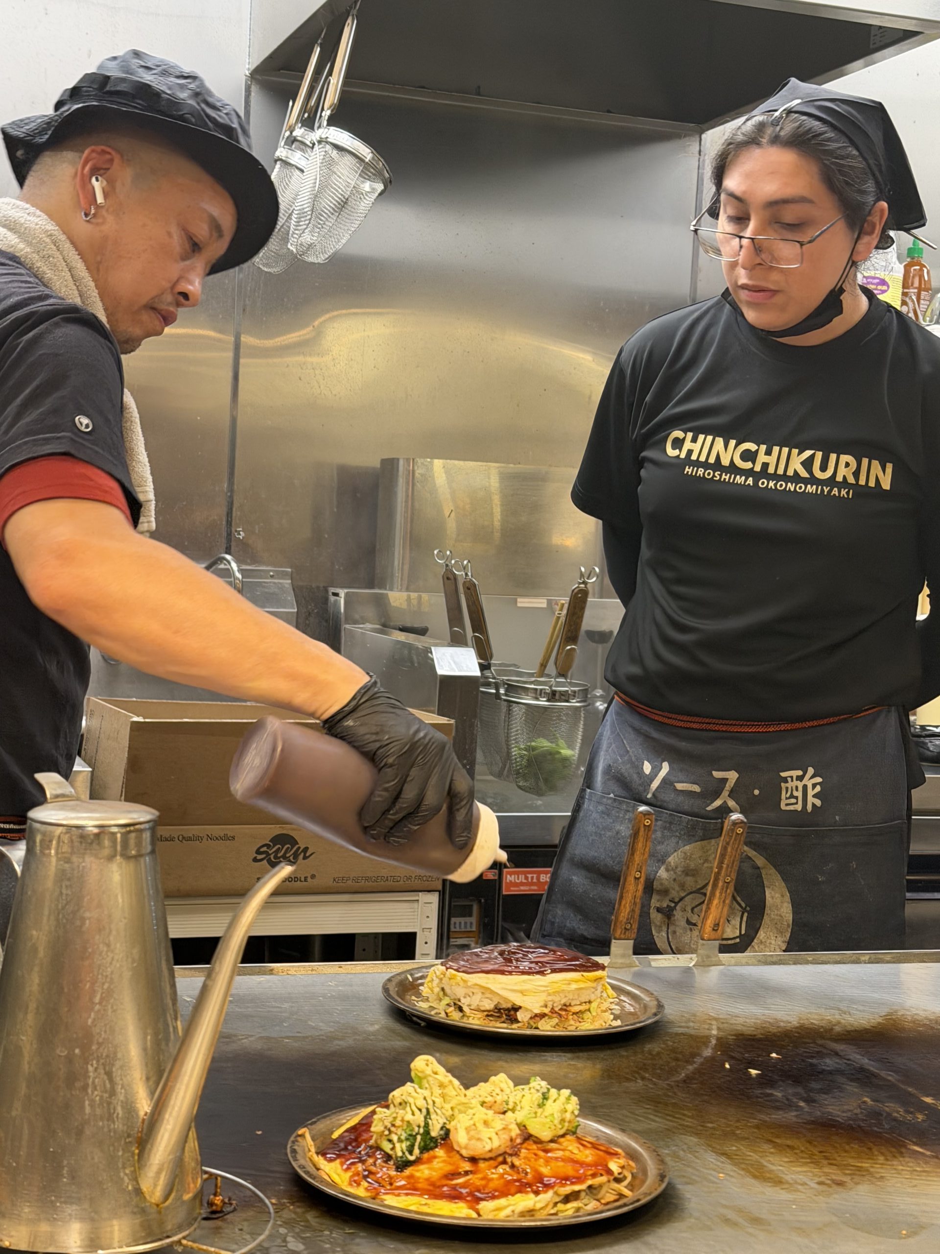 A trainee chef watches as a master sauces okonomiyaki on the grill.