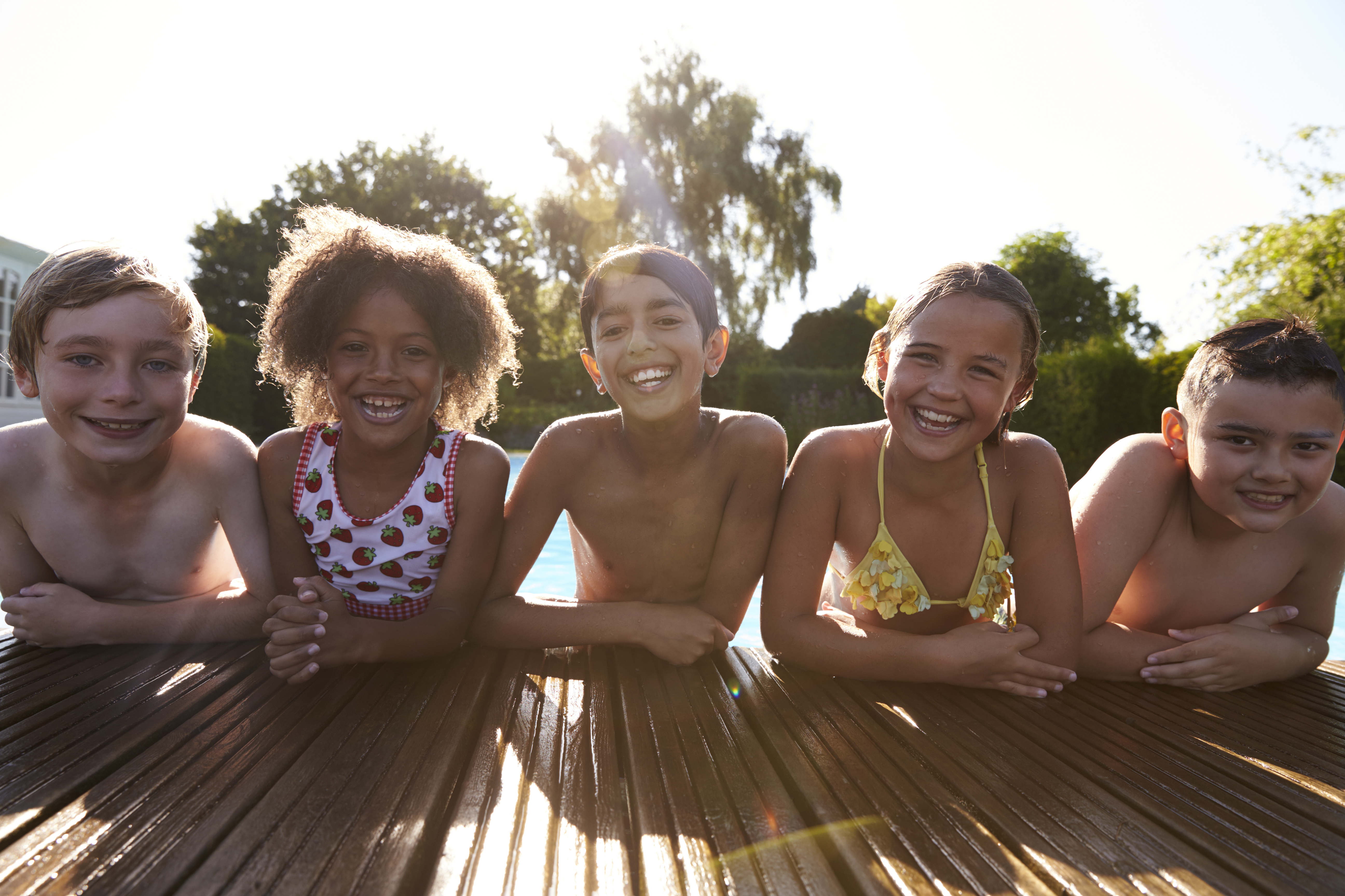 Portrait Of Children Having Fun In Outdoor Swimming Pool