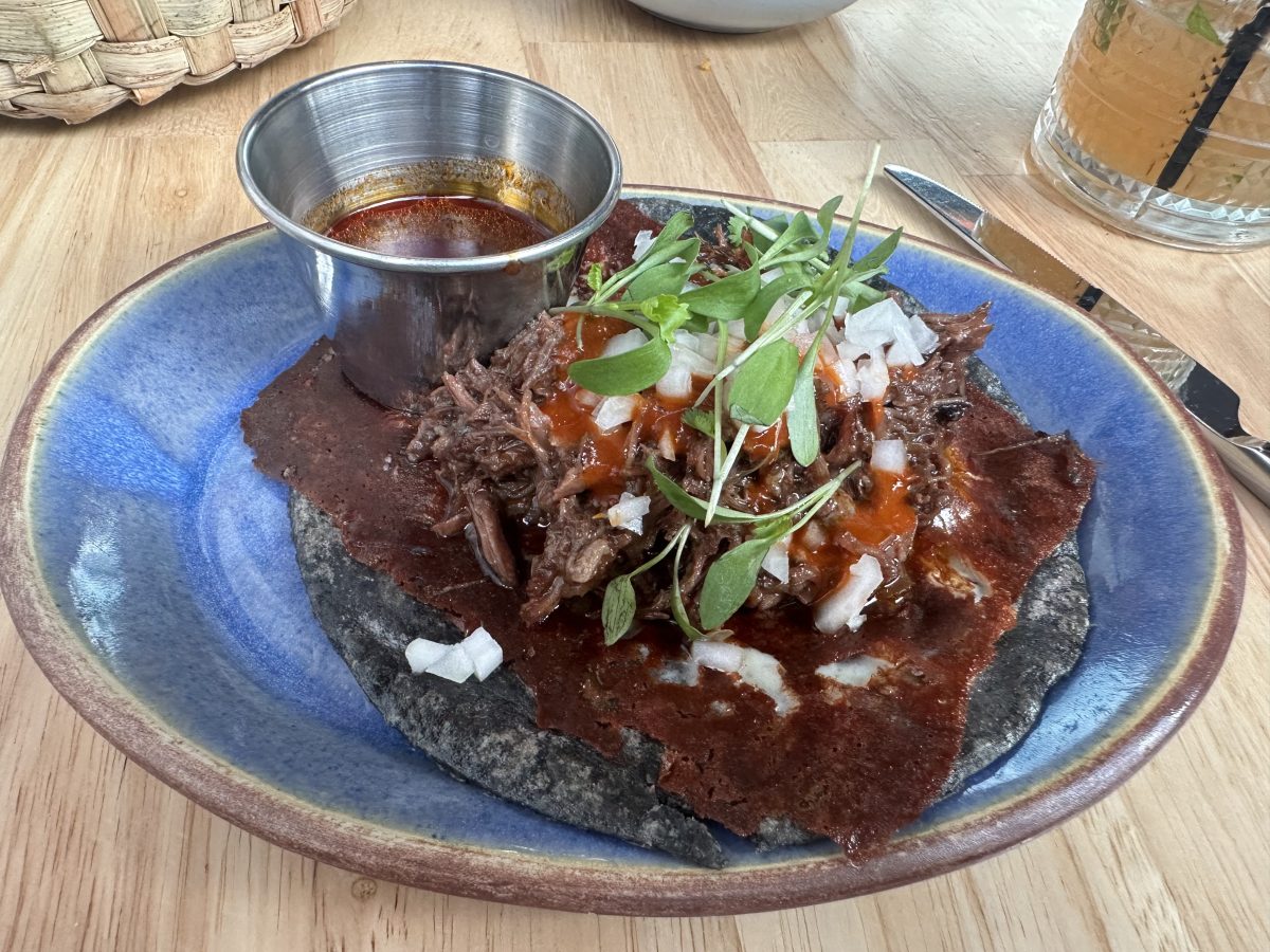 While sitting at the table, trying to figure out what to order, you might notice that the staff T-shirts are emblazoned with “feed me tacos and tell me I’m pretty.” If you guessed that means you should order tacos, congratulations, you are right. They are served in fresh, blue corn tortillas, the filling amounts are ample even on taco Tuesday when they’re on special, and they’re very very good. The Carnitas has a good mix of chopped crisp and soft pork, and there is a delicate chili flavor that is barely perceptible, but adds interest to the dish. The beef cheek is even better, soft and rich meat in an excellent birria sauce topped with crispy melted cheese and micro cilantro. There is a little consomme on the side that some people use to dip chips, but is even better to drink straight as a chaser for the taco. The shrimp Gobernador was a good rendition of a standard item, but the big surprise was the sweet potato taco. The vegetable was mixed with scallions, feta cheese, and crunchy masa and topped with pepita-almond salsa. This was almost sweet enough to be a dessert item, but taking a bite of one of these after one of the more savory tacos was a delightful break that made you ready to experience those flavors with a fresh palate.