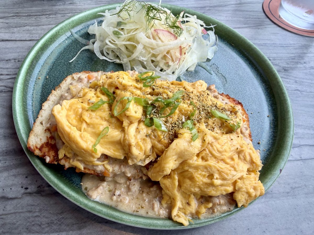 We returned for a weekend brunch and dined on the patio, only to find out while there that on one Sunday a month a DJ sets up nearby and blasts exercise music. If you prefer a quiet meal, sit inside on that day. I tried the biscuits and gravy made with chicken sausage instead of pork, while my wife had pineapple upside-down French toast made with both fresh and candied pineapple. Hers was too sweet for me but she found it delightful. Mine was a delightful twist on a southern classic, the use of chicken sausage rather than pork keeping it from being as greasy and heavy as the classic. A shot of green herbs added to the flavor, and the side of fennel slaw with apple and dill was very refreshing. I found that preferable to potatoes that are often served with this dish that already has enough carbs anyway.