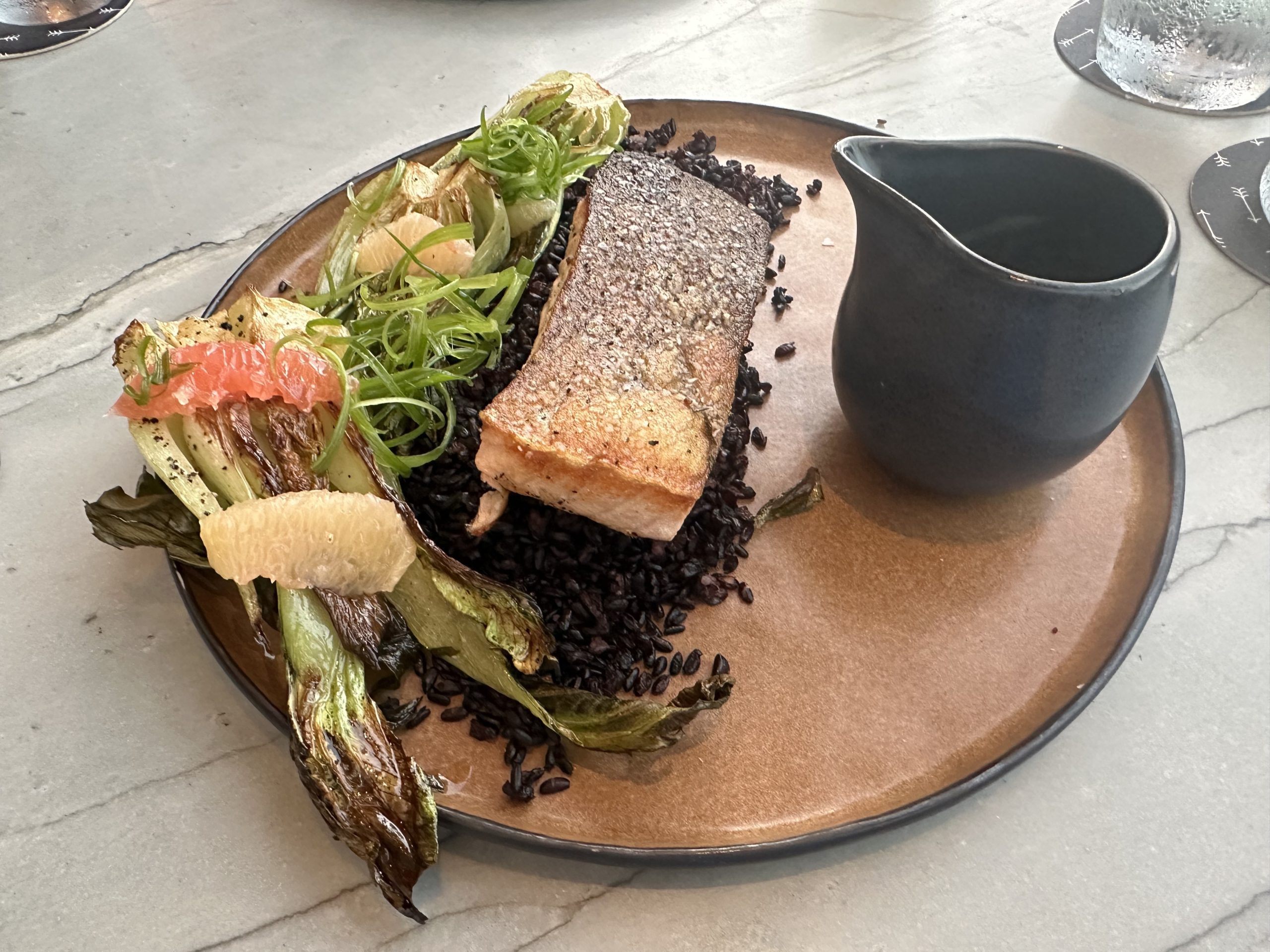 We were much happier with our main courses β cavatelli pasta with sweet corn, truffle pate, and mushrooms, a smoked and glazed pork chop topped with fruit, and pan-seared salmon with Asian vegetables. I had been more interested in the branzino with fennel soubise at first, but ordered the salmon because the accompaniments were more interesting β forbidden black rice, charred bok choy, pink grapefruit, smoked trout roe, frizzled leeks, coconut dashi, and radishes. It was a beautifully composed plate with an amazing variety of flavors and textures, and a complete success. I ordered the coconut dashi on the side rather than poured over the fish in order to keep the skin crisp, and advise that you do too.