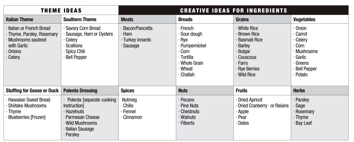The traditional bread stuffing ingredients are celery, onions, butter, winter herbs, and chicken broth (hopefully homemade). The bread should be good, chewy bread that has gone stale or dried in a low oven, not something store bought that was never bread to begin with. You can get a little creative by adding chestnuts, sausage or mushrooms, or maybe all three.