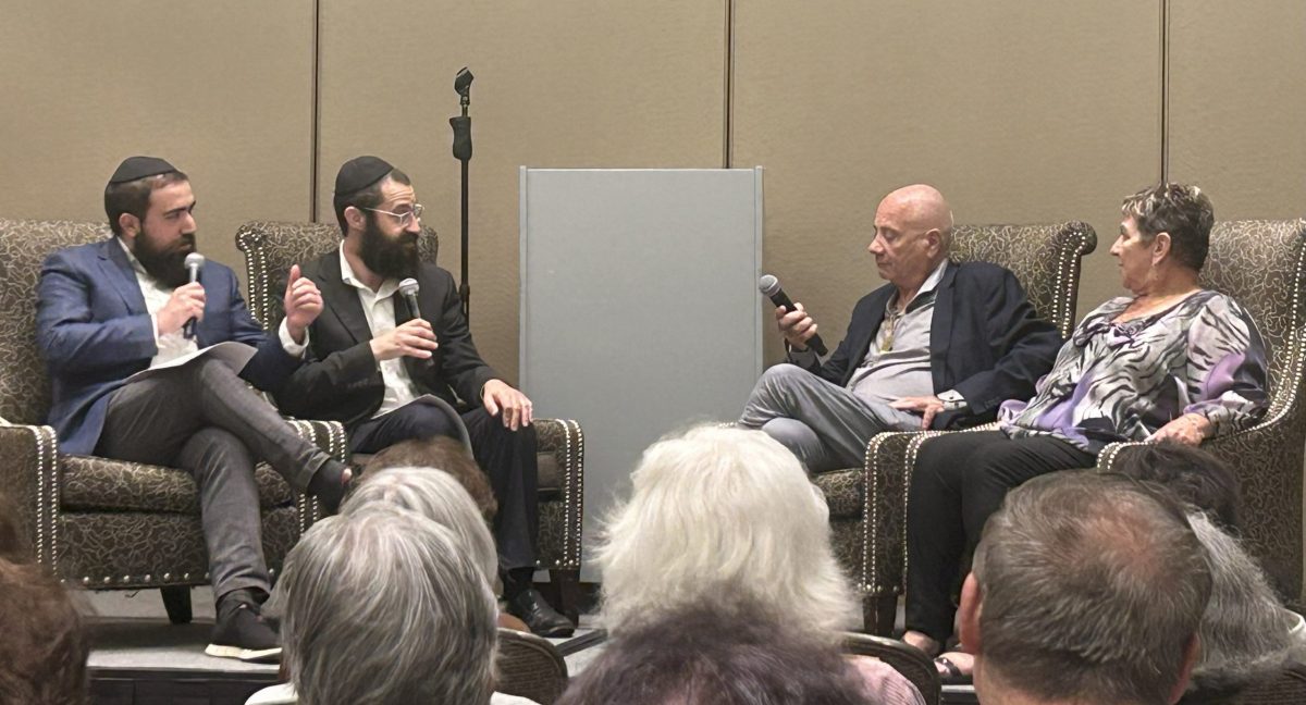 “Safe rooms are just (to guard against) missiles, not people,” explained Rabbi Mendel Mintz of South Redondo Synagogue, one of two interviewers on stage with the couple at Sonesta. Rabbi Zalman Gordon, of Jewish Community Center sat next to Mintz.