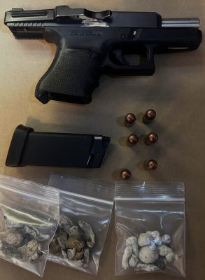 MBPD officers arrest a suspect who was found with an illegal handgun and baggies of Psilocybin mushrooms. Photos from Instagram @mbpolicedepartment