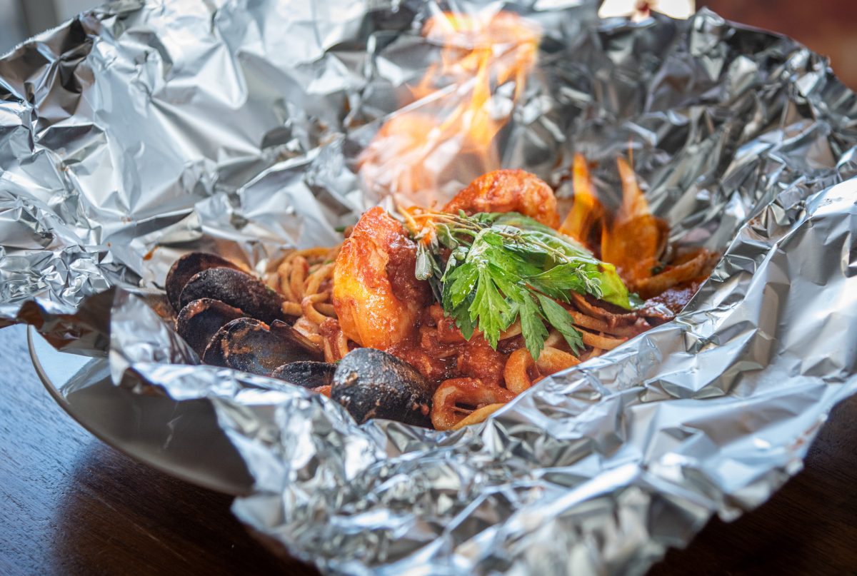 On our two visits we tried four entrees – tagliatelle with wild mushrooms, daily specials of lamb shank and spinach spaghetti amatriciana, and a show-stopping dish called cartoccio di pasta al frutti di mare. Cartoccio translates literally as “bag,” though in Italian cuisine this means wrapping pasta and meat or seafood in aluminum foil and baking it. This arrives at the table still wrapped, and when the server tears the foil, there is a great rush of fragrant steam. In case that wasn’t enough of a show, they then top this with fresh basil and a sprig of rosemary, which they light on fire. I thought this last touch was pure theatre, but it did have an effect, because you could taste a hint of smoky rosemary as you worked your way through the dish. Cooking the noodles and seafood together in a light tomato sauce concentrates the flavors of shellfish, squid, and shrimp, and it would be a must-have even if the presentation wasn’t so impressive. Note that the portion is very generous – this really would be a good entrée for two rather than one person.