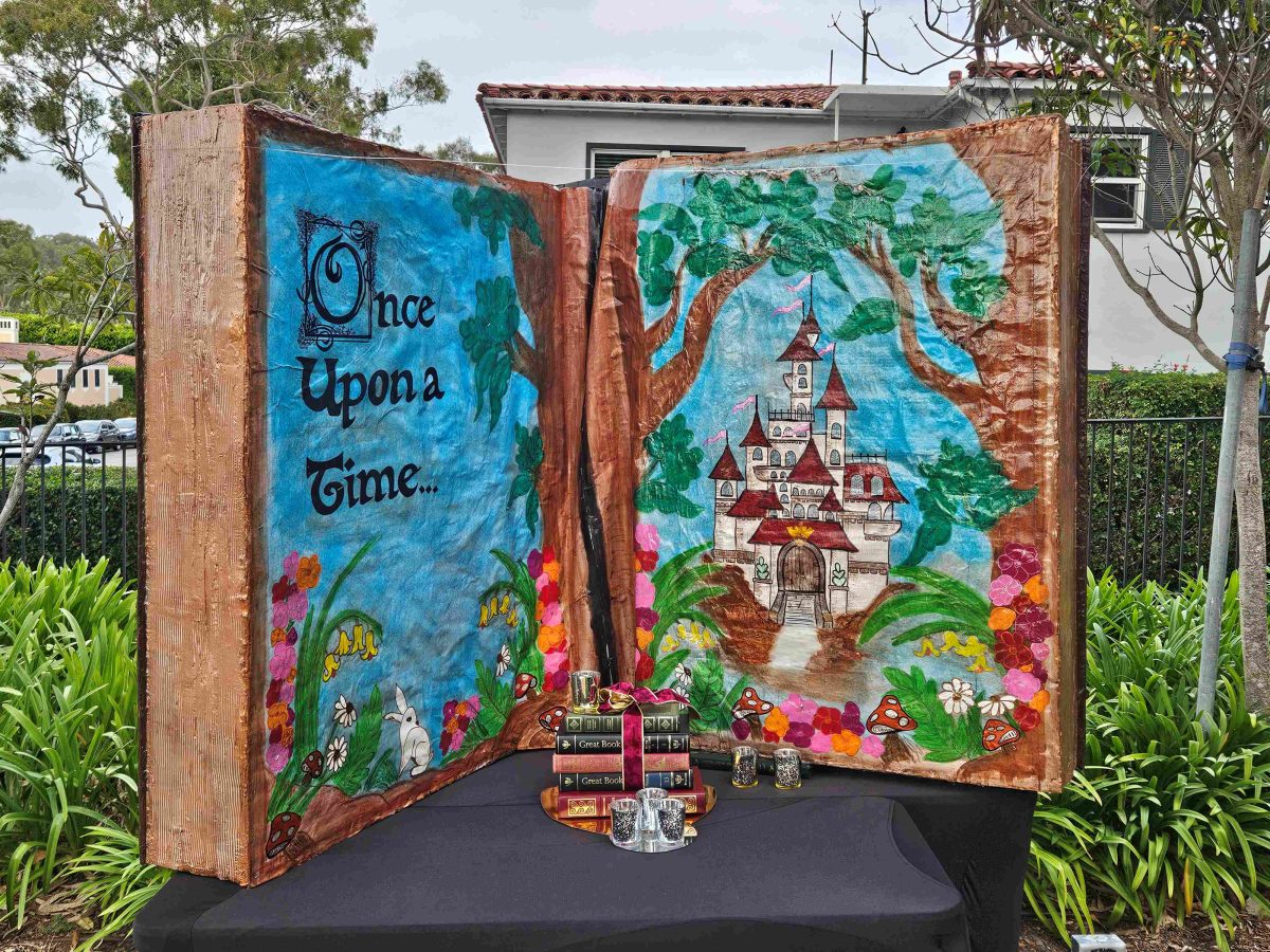 Twinkle lights stretched between the arches, votives flickered across the courtyard, and stacks of ribbon-tied novels lined the pathways. But it was the towering, four-by-seven-foot open book at the entrance that stopped everyone in their tracks. Painted with sweeping vines, curling script, and fairytale castle flourishes, it seemed to glow from within — an unexpected piece of theater in the middle of a quiet library courtyard.