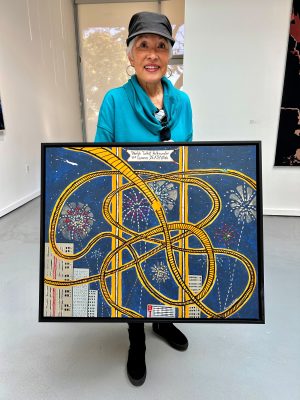 “I employed AI to compile 100 divisive slogans and narrowed them down to 20 from each side of the political split. I used them to create a satirical composition that shows well-intentioned people, signs aloft, spiraling down to a literal well of hell, intolerance paving the descent. I hope the painting has enough shock value to make viewers reconsider, and start a conversation along the lines of ‘the end game being intolerant of intolerance.’” Larry then pointed out that “I never do paintings with social commentary; this is a first. I hope it is meaningful.”