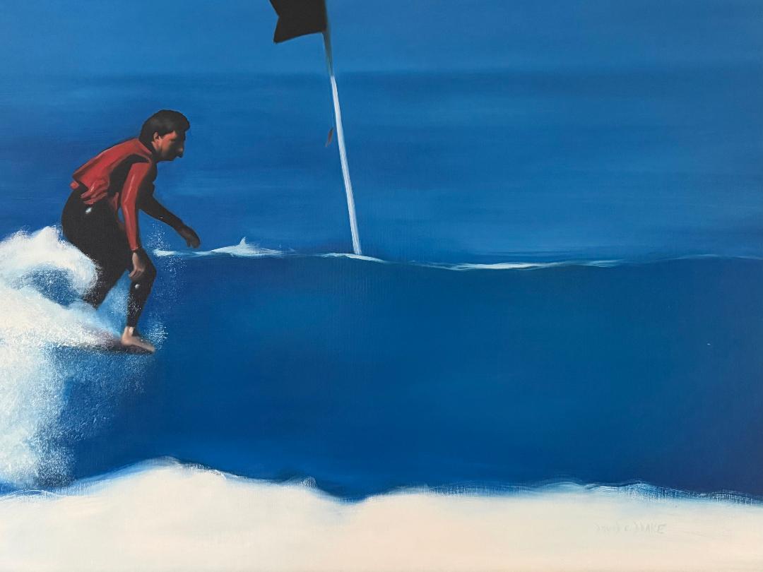 A painting from the contest by surf David Drake, based on a photo taken by surf photographer Bryan McStotts, hangs over the fireplace in the Agabright family home in San Clemente. The painting shows Agabright going left past a contest buoy with a black flag that almost drowned him.