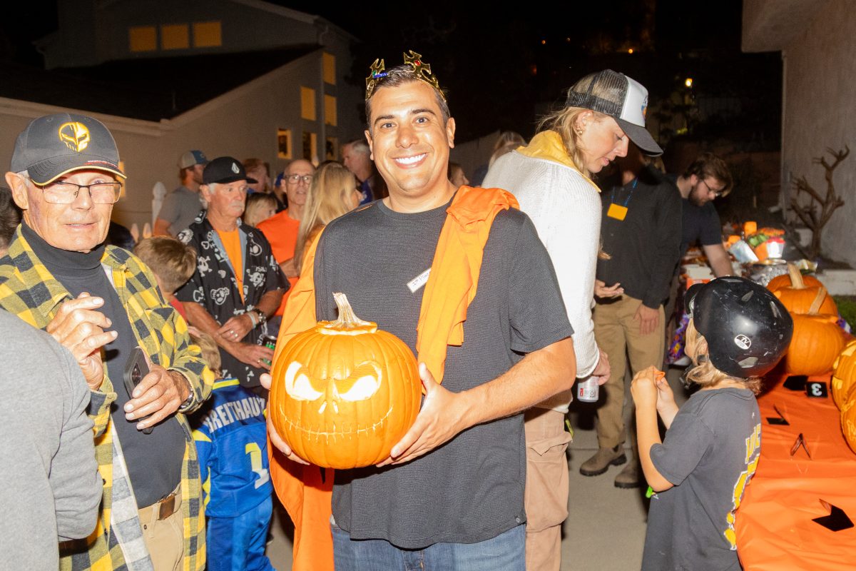 Andy Clifton (left) looks on in dismay upon learning his new tenant, Renee, had won the 52nd Annual 24th Place Hermosa Beach Pumpkin Carving Contest. Each year’s winner is required to host next year’s contest. Amy and KC Irwin hosted this year’s contest, but staged the often messy affair in the driveway of their unwitting neighbors, David and Koon Goldenberg.
